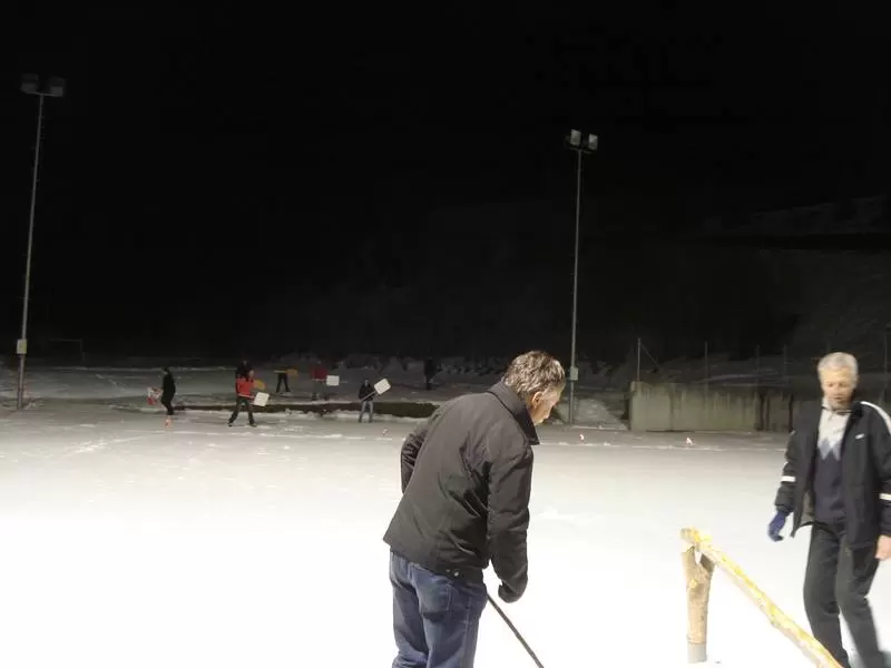 auf diesem Bild erkennen wir im Vordergrund den Schläger (Schlegr) und im Hintergrund das Spielfeld (Riis), in dem die Spieler der Gegenpartei versuchen mit ihren Schindeln den heranfliegenden Holzball (Tschärät) abzutun; Foto: Volmar Schmid