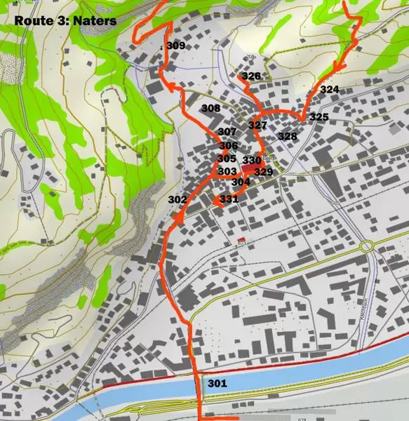 Die Route 3 führt vom Bahnhof Brig über die Rhone nach Naters; wir durchqueren die westliche Seite des alten Naters und steigen den alten Saumweg nach Geimen – Blatten. In Geimen wenden wir uns Richtung Bitschji und weiter zur „Armen Seelen“ Kapelle im Trämel. Dann steigen wir über den Weiler Hergdorn die Stahlgasse ab und erreichen den östlichen Teil des alten Naters und kehren nach dessen Besichtigung zum Bahnhof Brig zurück.