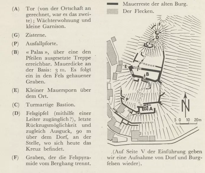 Die als Ruine erhaltene Burg auf dem ins Tal heinausragenden Felsvorsprung ist, den drei vorhandenen Wehrabschnitten nach zu schliessen, wohl in drei Etappen gebaut worden.