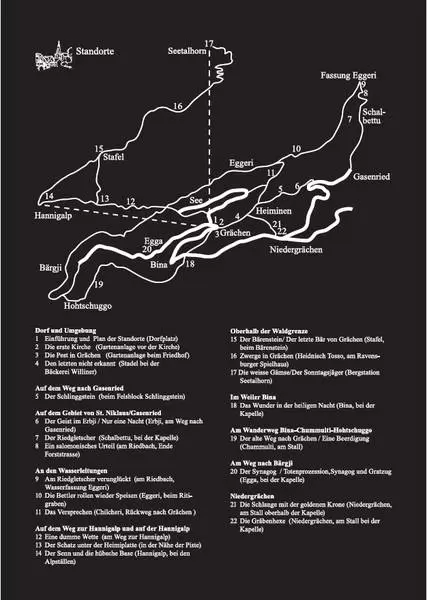 Die übrigen Erzählungen befinden sich an den Wegen zur Hannigalp, zum Seetalhorn, zum Hohtschuggo und in den Weilern Egga, Bina und Niedergrächen. Sämtliche Standorte der Tafeln sind in der Liste aufgeführt. Genaue Routenbeschreibungen enthält die Broschüre «Unterwegs in Grächen».