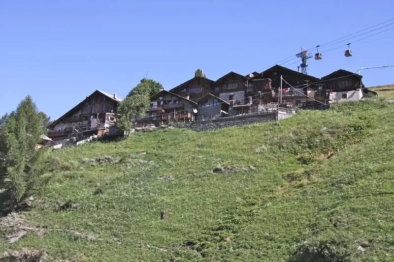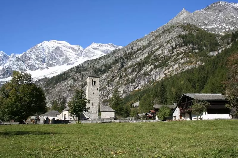 Es war Mittelpunktsiedlung der von den Walsern bewohnten umliegenden Weiler, die den Canton des Allemands bildeten. Im Hintergrund das westliche Monte Rosa-Massiv.