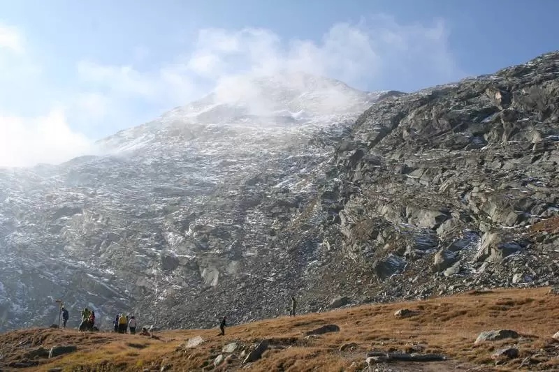Meinen ersten Gang über den Monte Moro unternahm ich im Sommer 1970. In Saas Almagell deckte ich mich mit Lebensmitteln ein und brach mit etwa 20 Kilogramm im Rucksack noch bei Dunkelheit an einem Freitagmorgen in Richtung Mattmark auf. Hinter dem Stausee, den man beidseitig «umrunden» kann, steigt der Weg an zum Tälliboden und weiter zum Monte Moropass, an dessen Südseite das im Winter 1997 zerstörte und neu aufgebaute Rifugio Caspare Oberto (2785 m ü. M.), zur Rast einlädt.