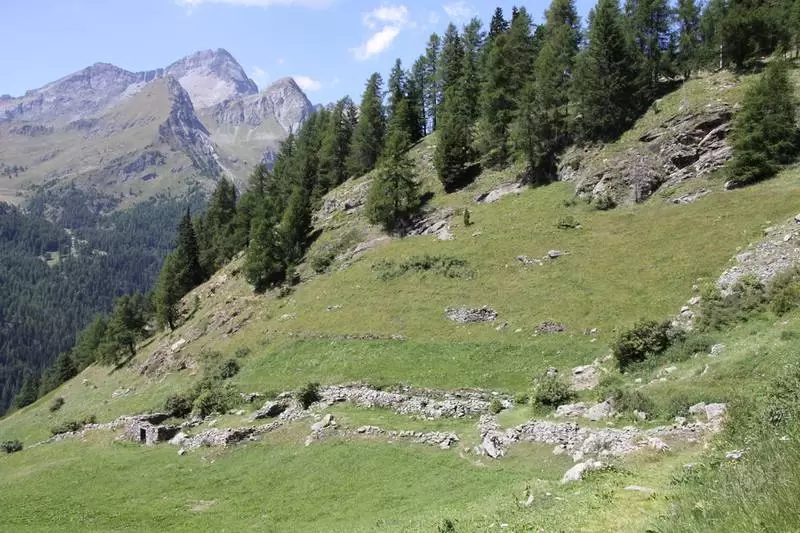 Nach einem zuerst steilen Abstieg wanderte ich dem Weiler Cunéaz (2032 m ü. M.) zu, wo in den 1920er Jahren die rasch fortschreitende Entvölkerung einsetzte. Gegen 1960 war Cunéaz als Dauersiedlung aufgegeben, was einerseits mit der fehlenden Anbindung an den Verkehr, andererseits mit dem Aufkommen neuer Lebensformen im Val d’Ayas zusammenhing. Heute führt ein Fahrweg nach Cunéaz.