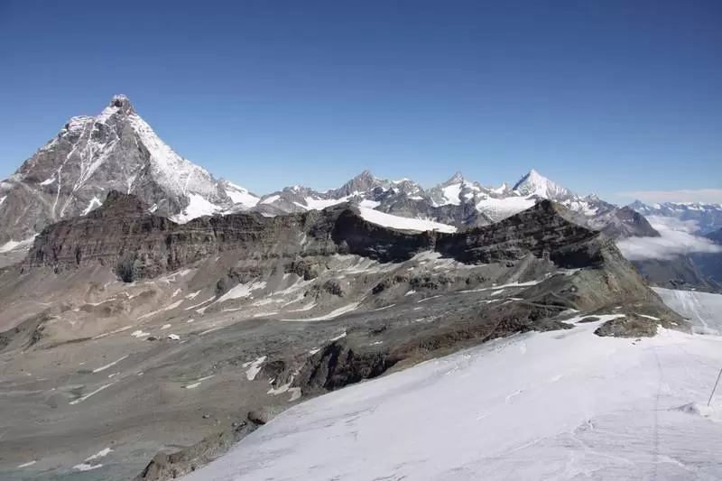 Von nun an geht,s bergab: auf dem Gletscher zur Seilbahnstation Trockener Steg oder hinunter nach Zermatt.