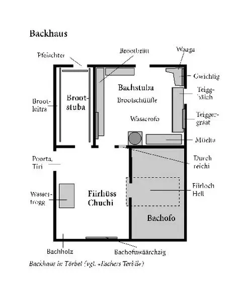 Das Backhaus bestand aus verschiedenen Räumen: in der beheizbaren Backstube wurde der Teig hergestellt und zum Backen vorbereitet. Da die Teige genügend Wärme brauchten, um sich entfalten zu können, war es in der Backstube gegen 30 Grad warm. Backen und vor allem das Teigen war eine Schweiss treibende Arbeit. Hier in der Backstube befanden sich alle Werkzeuge und Geräte, die zur Produktion des Teiges notwendige waren. Der Teig wurde in der Müelta (Backmulde) produziert und mit Sauerteig aus dem letztmaligen Backvorgang versetzt, dann auf dem Knettisch geknetet und geformt und anschliessend auf Brotbrettern bis zum eigentlichen Backvorgang gelagert.
