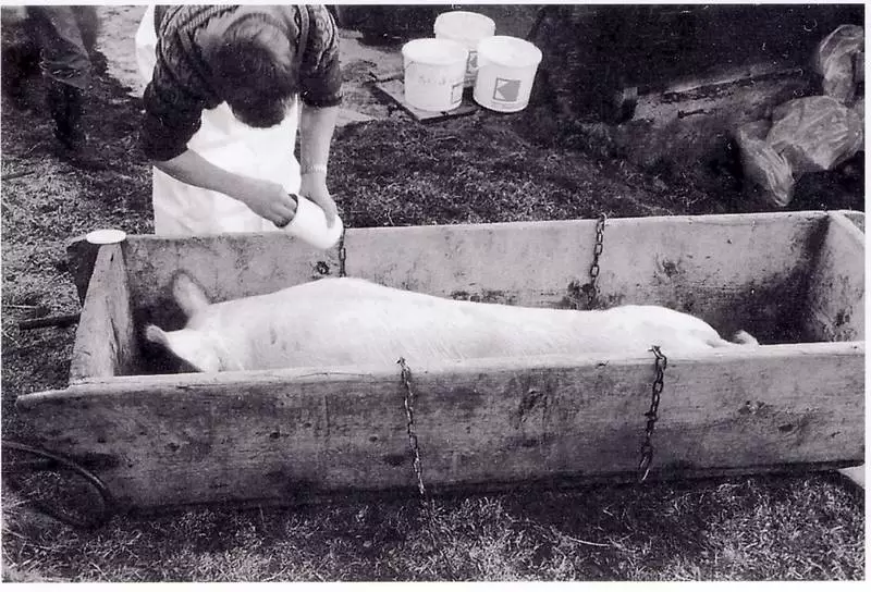 Mit einem scharfen, spitzen Messer wird die Halsschlagader aufgestochen und dann das Schwein ausgeblutet. Das Blut wird aufgefangen und zu Blutwürsten verarbeitet. (Quelle. Maurus Schmid, S.183)