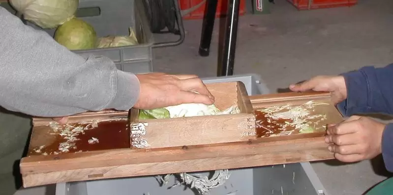 Der Kabis wird zuerst gewaschen, geviertelt und der Strunk entfernt. Die äusseren Blätter legt man dabei beiseite. Mit einem speziellen Kabishobel kann nun der Kabis fein geschnitten werden (siehe Abb. 1).