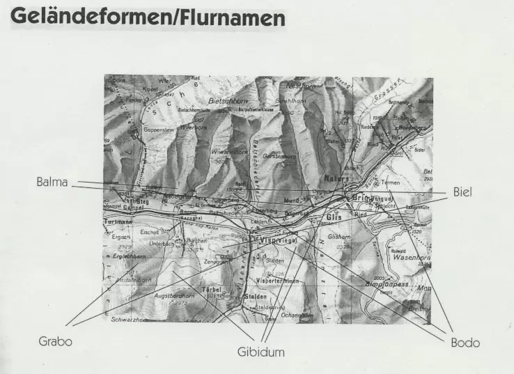 Wer die Handfläche auf eine 50'000er Karte legt, findet mit Sicherheit zweimal den gleichen Flurnamen. Ein Phänomen, dem ich diesmal etwas genauer nachgehen möchte, darum habe ich mich entschlossen, in diesem «Kleinen Wörterbuch» häufigen Flurnamen und ihrer Bedeutung nachzuspüren. Als Basis für die Sammlung gilt die Landeskarte der Schweiz im Massstab 1:25'000 und es wurden nur Namen aufgenommen, die mehrmals vorkommen und solche mit denen Geländeformen grundsätzlich beschrieben werden. Als Grundlage für die Schreibweise gilt – wie für die übrigen Beiträge das «Kleine Walliserdeutsche Wörterbuch» – mein, mit der Zeit etwas abgeflachter, Ausserbergerdialekt. Ich übernehme bewusst nicht die Schreibweise der Karte, wurden doch hier viele Namen in ein künstliches Schriftdeutsch umgesetzt oder phonetisch an das übrige Schweizerdeutsche angegliedert (z.B. Holzgrabe > Holzgrabo; Aussenberg > Osserbäärq, Ranft > Raanft). Wo Namen schwierig zu erklären waren oder sich nicht so einfach ins Hochdeutsche transferieren liessen, zeigt auch die Karte die ortsübliche Lautung (z.B. Maachi > Maachi(n), was nichts anderes sagen will, als das «Chi(n)» bei St. German). Die Nasalierungen markiere ich durch ein in Klammer gesetztes «n» (z. B. Ba(n) = der Bann).