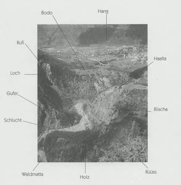 Zur Entstehung der Namen habe ich ein paar interessante Beobachtungen gemacht; sehr oft bezeichnen sie einfach die Sache selbst (Holz, Bach, Matta, Ägerta etc.), die aber dann in vielseitigen Zusammensetzungen spezialisiert werden, z.B. mit anderen Allgemeinnamen (Bachtola), mit der Funktion (Milibach, Maarchgrabo), mit der Eignung (Chüebodo, Schaafmatt) mit der Ausdehnung oder Form (Breitmatta, Chrummbach; ein besonders faszinierendes Beispiel habe ich in der Vergleichsform Bischofchappa unterhalb des Glishorns gefunden), oft gibt der Name auch die Lage an (Unnerbäch, Üsserbinn, Oberwald, eine Kombination zwischen Lage und Form scheint mir im Wort Widerfald [643/123] zu liegen, es ist der Ort, wo das Gelände «wieder fällt»), manchmal gibt den Name auch den Besitzer an (Walterbiel, Perrigalpjl), manchmal die Farbe (Griewald, Wissi Riischa) oder die emotionale Betroffenheit (Fiischterschlüecht).