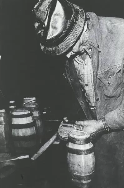 Als nächstes legt der kundige Fachmann die acht Kufen in siedendes Wasser. Weniger lange als Kartoffeln brauchen, bis sie gar sind — um die zehn Minuten! So werden die Kufen weich und halten sich mit Hilfe von zwei provisorischen Ringen in der richtigen Form, bis sie trocken sind. Dann erst — nach rund zwei Tagen — geht's an die Fertigstellung! Die vier kunstvoll zusammengefügten Ringe legen sich über die Kufen, Mund- und Bodenstück werden eingesetzt, das «Butilli» wird mit dem Holzzapfen verschlossen und ein lederner Tragriemen vervollständigt das kleine Kunstwerk. Ein «Butilli» ist fertiggestellt!“