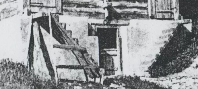 Der Eingang in den Viehstall befindet sich in der Mitte der Vorderfront. Er wird, wenn die Stallwand genügend dicki ist, durch eine innere und eine äußere Türe Poort verschlossen. Ist die Winterkälte vorbei, so wird die eine Türe ausgehoben. Die andere Türe ist in ihrem oberen Teil fensterartig durchbrochen und durch eingesetzte Holzstäbchen in ein Gitter verwandelt. Durch das Gittertürchen Ripputiri n. dringt frische Luft in den Stall, die wiederum, wenn es nötig wird, durch ein rasch zwischen den Rippen durchgedrehtes Strohgeflecht abgehalten werden kann. Noch bequemer kann die Luftzufuhr reguliert werden, wenn die Türe in eine obere und eine untere Halbtüre geteilt ist (vgl. Abb links). Als ungeeignet hat sich hingegen die Spaltung der (inneren) Türe in zwei Türflügel Fligil erwiesen, die sieh nach innen öffnen. Die Kühe werden eingeklemmt, wenn sie den Durchgang nicht sorgfältig genug passieren und an einen Türflügel stoßen.