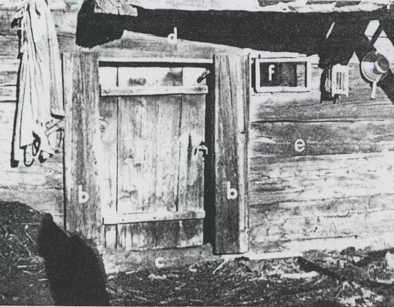a) Türe, b) Türpfosten, Biistall, c) Türschwelle, d) Oberturner, e) Wandbalken, f) Schiebefenster; Quelle: Rübel, s.d.