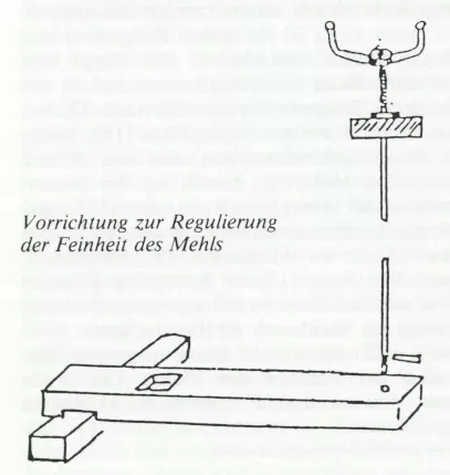 Ganz raffiniert war die Einrichtung zum Einstellen der Feinheit des Mehls. Die Welle samt Wasserrad und rotierendem Mühlstein stand auf einem Lärchenbalken (vgl. 3). Dieser Lärchenbalken ruhte quer auf einem andern und hing am andern Ende an einer Stange, die über eine Schraube gehoben oder gesenkt werden konnte. Mit ihr hob oder senkten sich auch die ganze Welle und der laufende Mühlstein. So einfach war das. Ein Problem stellte sich für viele Müller, die nicht warten wollten, bis der gefüllte Korntrichter leer war. Sie wurden zu Erfindern, um die Mühle selbsttätig zu stoppen. Der letzte Müller in Ernen hatte im Trichter eine Klappe festgemacht. War der Trichter gefüllt, wurde die Klappe hinuntergedrückt. Diese war über eine Umlenkrolle am Dach mit einem Gewicht verbunden. War der Trichter leer, sprang die Klappe hoch, das Gewicht fiel auf die Leitung, die zum Wassereinlauf am Ende der Wasserzufuhr ging und dort mit einem Deckel verbunden war. Das Gewicht löste einen Bolzen, der den Deckel hielt. Dieser fiel nun zu und stoppte den Wassereinlauf, die Mühle stand still.