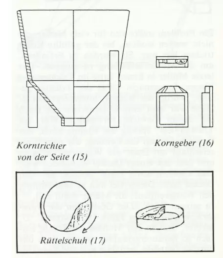 Korntrichter, Korngeber und Rüttelschuh; Erklärung im nebendstehenden Text; Quell Josef M. Imhof