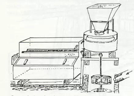 Querschnitt durch eine Stockmühle mit Korntrichter, Mahlwerk und Mehlkasten; Quelle: Josef M. Imhof
