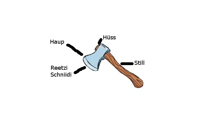 Die Breitaxt Pioola (Abb. d) brauchte der Bauer vorwiegend zum Behauen der Baumstämme, nachdem er zuerst mit der Waldaxt die Rinde, Rinna, entfernt hatte: gschintot het. Selten geworden ist die Hohlaxt, Hoola, Schääla, Hoolagschi genannt. Sie diente dazu , um Kännel, Chännil und Tröge, Trogg herzustellen. (vgl. Camill Schmid)