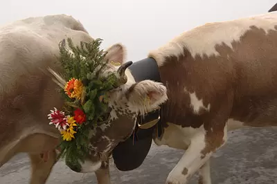 Alpabzug mit schön geschmückter Treichelkuh