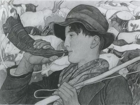 der Hirte bläst hier das Rufhorn (Truphooru) und ruft damit die Herde zusammen.