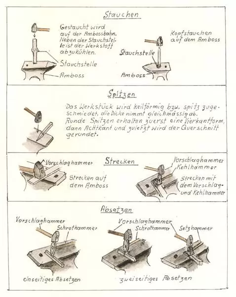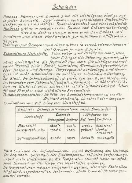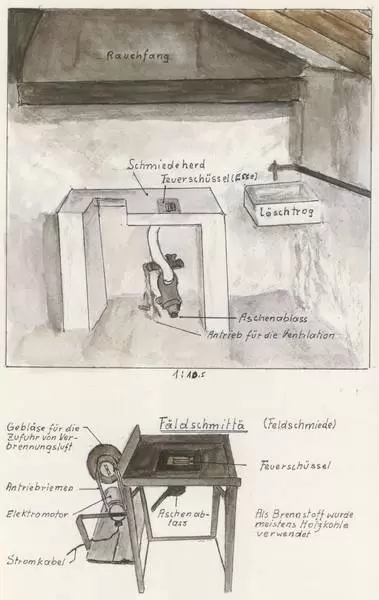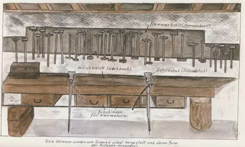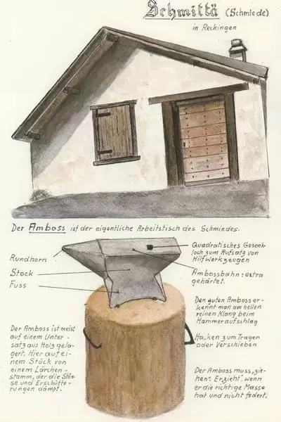 Da man in früheren Zeiten alles Metall teuer einführen musste, wurde nur das absolut Notwendige aus Metall hergestellt: Werkzeuge, Messer, Nägel. In jedem Dorfe gab es einen oder mehrere Schmiede, die die notwendigen Gebrauchgegenstände herstellten oder reparierten. Am Beispiel der Dorfschmiede von Reckingen, die Hans Schmidt in seinem Buch "Bsinnscht di nu?" und seinen Zeichnungen einmalig festgehalten hat, möchte ich hier die verschiedenen Begriffe und Techniken des alten Schmiedeberufes wiedergeben.