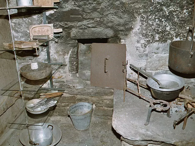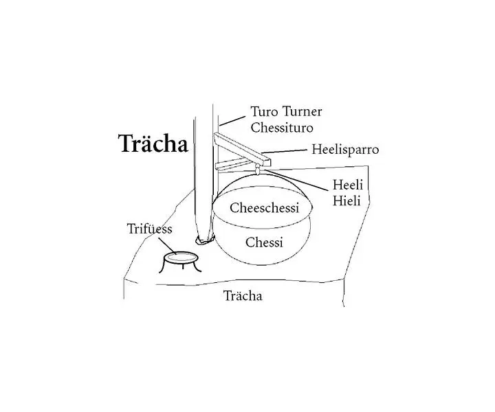 Die entrahmte Milch wurde früher in den kupfernen Hauskessel Hüüsschessi, Chessi geschüttet. Das war ein weitbauchiges Gefäß, versehen mit einem halbkreisförmigen eisernen Henkel. Der Henkel war in zwei Ohren, Oorinu beweglich am Kessel angebracht. Oft diente der Kesseldeckel auch als Traggestell des Seihtrichters, Seitrichter mit dem Seitüech weshalb er am vordern Rand ein kreisrundes Loch aufwies. Statt dessen diente vor allem den ältesten heute noch lebenden Bellwaldern das Kaderli als Traggestell der Folla. Diese Hauskessel hingen zur Jugendzeit unserer Eltern noch an einer Eisenkette Hääli, die oben an einem Balken befestigt war. Erst allmählich wurde die Hääli durch den drehbaren galgenähnlichen Holzständer Turner ersetzt, der seinen Platz auf der Trächa in der Küche hatte. Bei dieser Vorrichtung hing der Kessel an dem waagrechten abstehenden Tragbalken Turneraare. Der eigentliche Turner, d. h. der senkrechte Balken, war um seine eigene Achse drehbar, indem er oben und unten beweglich in Holzlager eingelassen war. In etwa halber Höhe des senkrechten Balkens stand waagrecht der Tragbalken Aare ab. Ein Stützholz reichte von einer Kerbe an der Unterseite des Armes schräg in eine Kerbe des Drehbalkens hinein. Der Henkel selber lag in einem kleinen Einschnitt. Seit dem Verschwinden der offenen Feuerstelle gehört auch die Hääl- und Turnervorrichtung der Bellwalder Bauernküchen der Vergangenheit an. Am Turner käst man später noch auf der Alp und in den Maiensäßen während des Monats Juni. Hier hängt der Kessel in einer Ecke der Hütte über der Feuerstelle, Trächa, die halbkreisförmig mit kleinen Steinplatten Gschgaaje umgeben ist.