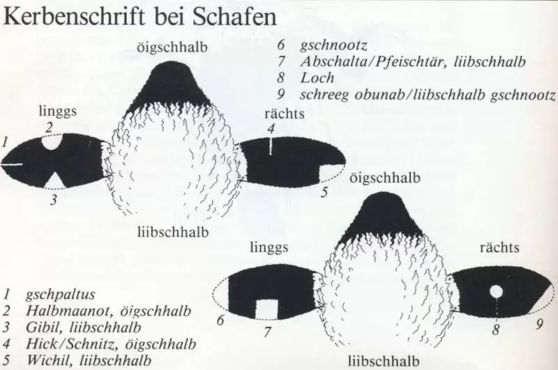 - dann spielt die Form des Schnittes eine Rolle (vgl. Grafik links): 1. gschpaaltus, gespalten, Schnitt; 2. Halbmaanot, Halbmond; 3. Gibil, Giebel, Dreieck; 4. Hick/Schnitz, Schnitt, Einschnitt quer zum Ohr (öügsch- oder liibschhalb) ; 5. Wiichil, Winkel, Ecke aus der Ohrspitze (öügsch- oder liibschhalb); 6. gschnootz, geschnitzt, Ohrspitze wird abgeschnitten; 7. Abschaalta/Pfeischter, Viereck (öügsch- oder liibschhalb); 8. Loch, Loch; 9. schreeg obunab/liibschhalb gschnootz, schräges abschneiden der Ohrspitze, schräg zur Leibesseite.
