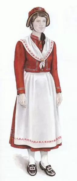 Der Rock ist aus Wolle, Baumwolle oder gemischt in Rot, ohne Ärmel, runder Halsausschnitt mit Knopflöchern und Holzknöpfen, am Rücken und vorne Abnäher.
