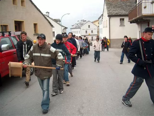 Rätscha, Täggi (Lötschental) Holzrassel, die in der Karwoche das Glockenläuten ersetzt; immer häufiger wird sie auch an Fasnacht als Lärminstrument eingesetzt.