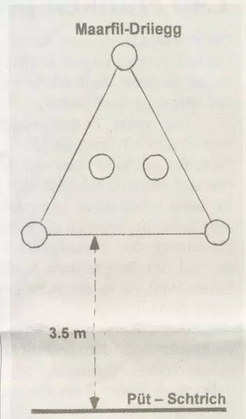 Für das Murmelspiel musste der Boden trocken sein. Manchmal wurde es mit bis zu sechs Teilnehmer gespielt. Jeder Spieler musste der Reihe nach fünf Murmeln ins Dreieck (Driiegg) setzen. 3.5 Meter hinter dem Dreieck war der Püt-Strich, (Wurlienie, von putten = werfen, schlagen) von dem aus jeder Spieler beginnen musste. Wenn ein Spieler alle fünf Murmels aus dem Dreieck spicken konnte, hatter er gewonnen und konnte die fünf Murmeln behalten. Hat er aber nur drei oder vier Murmeln aus dem Dreieck gespickt, machten die anderen Spieler Jagd auf seine Wurfmurmel (Pfigger). (Die Spieler hatten unterschiedliche Murmenl, kleiner Ton- oder Galsmurmeln, Maarfle, das waren die Gejagten, und grössere Glas- oder Eisenmurmeln (Botsche oder Pfigger von pfiggu = mit Daumen und Zeigfinger spicken), mit denen wurde geworfen und die kleinen Murmeln "abgetan". Anm. die Redaktion). Wer den (Pfigger) bekam, konnte auch die verbliebenen Murmeln jagen, d.h. herausspicken, traf er, konnte er sie behalten. Die besten Spieler hatten manchmal alle Hosentaschen voll Murmeln (Maarfle): auf der einen Seite die Ton- oder Erdgutmurmeln, in der anderen die Glasmurmeln.