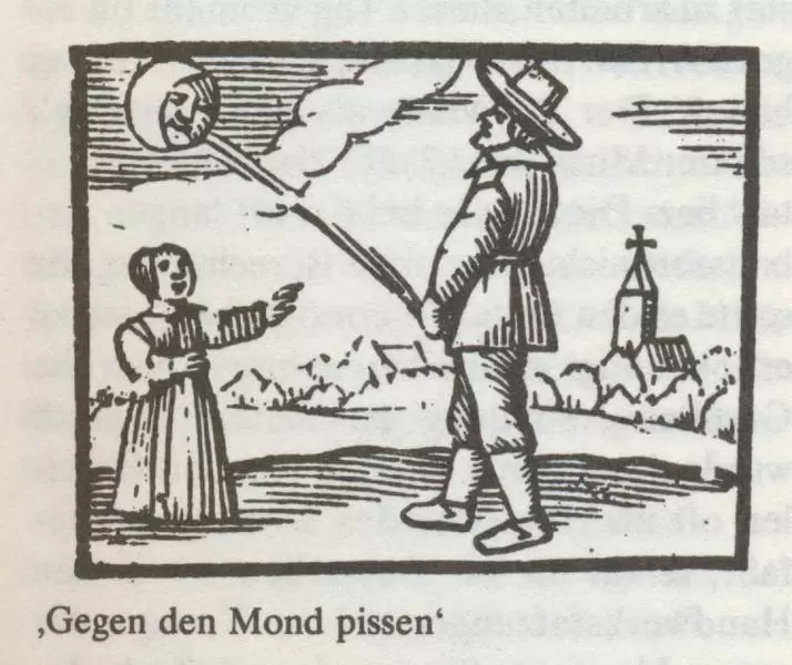 ... gägu du Maano schiffu..., gegen den Mond pissen; etwas Unmögliches, Törichtes versuchen. Variante: ... gägu du Wint schiffu..., gegen den Wind pissen.